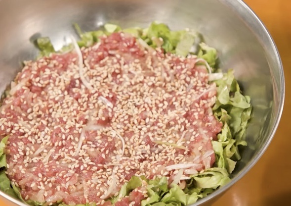 싱싱한 채소와 야무지게 버무리고 고소한 참깨를 빼곡히 뿌려주면