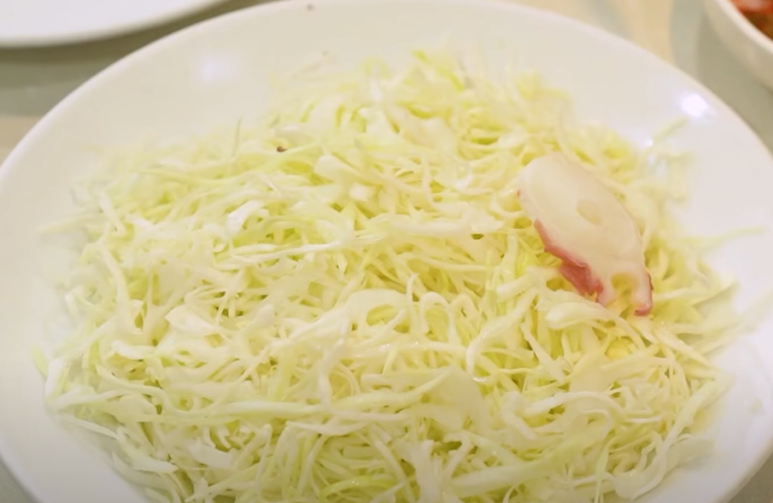 참문어를 먹기 좋게 예쁘게 잘 썰기 위해서는 냉동을 시킨다고 한다. 냉동 후에 해동되면서 나오는 물이 밑에 쌓이는 것을 방지 하기 위해 양배추를 놓는 것이라고..그리고 맛도 괜찮다고 한다.